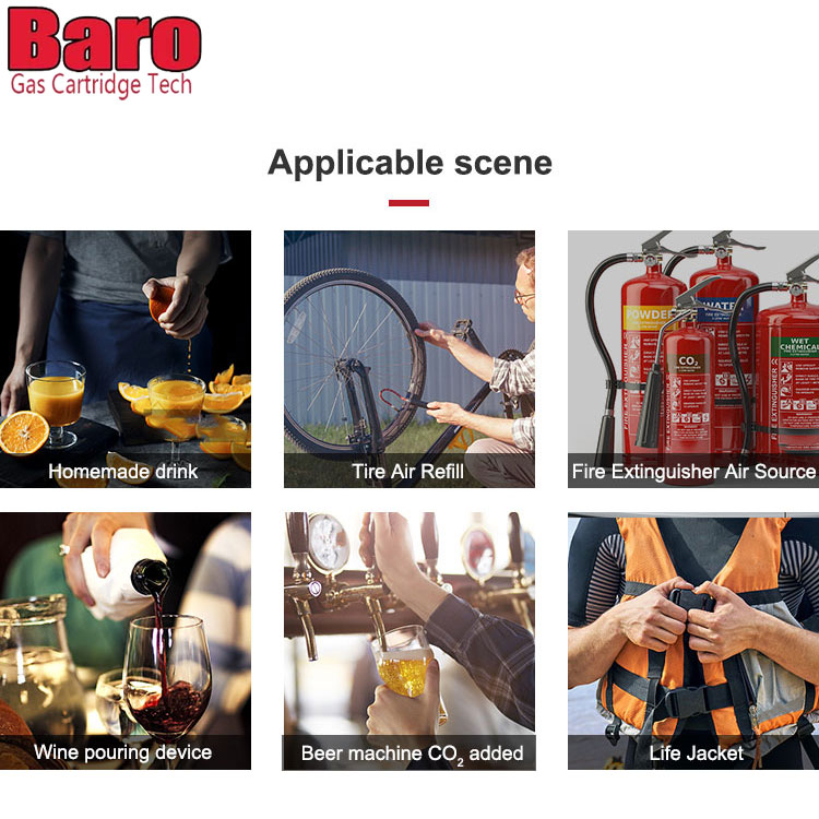 Картриджі преміум-класу на 33 г CO2 призначені для ручної версії надувного рятувального жилета (включно з рятувальним жилетом, сумкою на поясі або особистим плавучим пристроєм (PFD). Балони з балоном CO2 на 45 г для надувного рятувального жилета сумісні з рятувальними жилетами та використовують різьбу 1/2 дюйма CO2 картридж.